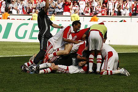 Der 1. FC Köln hat den Aufstieg in die erste Fußball-Bundesliga perfekt gemacht. Nach einer Klassevorstellung besiegte der FC den Aufstiegskonkurrenten aus Mainz hochverdient mit 2:0. Die Gäste blieben weitgehend harmlos und hatten dem couragierten Spiel der Kölner kaum etwas entgegen zu setzen. Matchwinner war der erst in der Rückrunde gewaltig in Fahrt gekommene Libanese Roda Antar, der beide Treffer markierte und damit die 50.000 Zuschauer im ausverkauften RheinEnergieStadion in einen Freudentaumel stürzte. Nach Abpfiff des guten Schiedsrichters Michael Kempter stürmten den Fans den Innenraum und verwandelten das Stadion in die größte Partyzone Kölns.