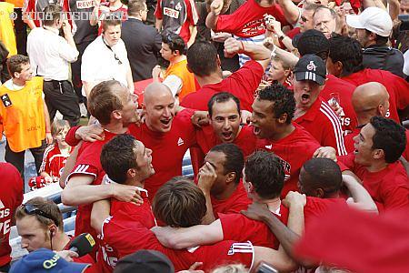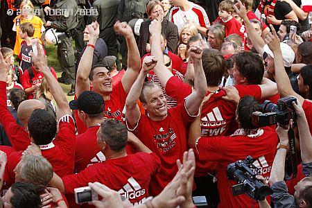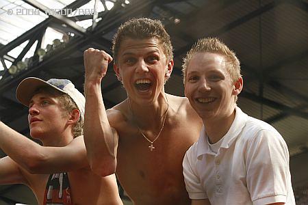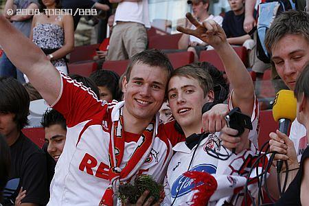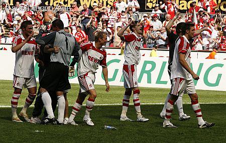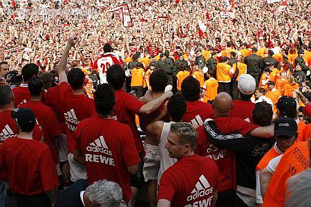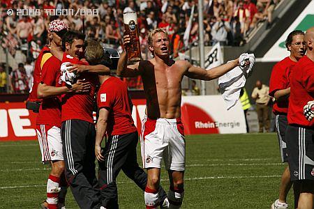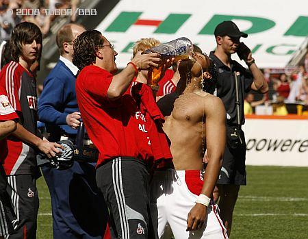 Da hatten die Kölner Kicker nach der kurzen Feier inklusive der obligatorischen Bierdusche bereits das Feld fluchtartig verlassen. Doch die Truppe von Trainer Christoph Daum präsentierte sich den Fans von der Haupttribüne aus und feierte ausgelassen mit ihren Anhängern. Auch in der Stunde des Triumphes vermied es der Coach, seine persönlichen Zukunftspläne zu offenbaren und den Fans zu versprechen, auch in der kommenden Saison seine Arbeit in der Domstadt fortzusetzen.