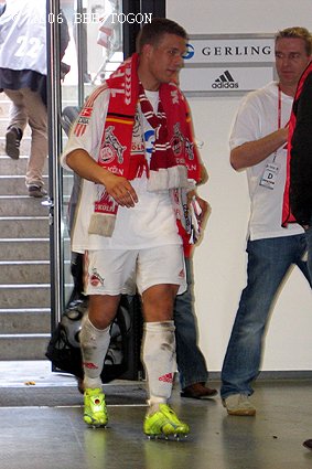 Lukas Podolski nach seiner Ehrenrunde mit etlichen FC-Schals.