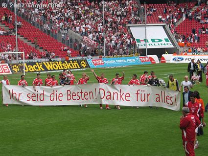 Nach dem Spiel bedankten sich die FC-Kicker mit einem großen Transparent („Ihr seid die Besten, Danke für alles“) bei ihren leidgeprüften Anhängern, die vor dem Anpfiff eine tolle Choreographie mit der Botschaft „Der 1. FC Köln das sind auf ewig wir“ auf die Südtribüne gezaubert hatten. FC-Trainer Christoph Daum verzichtete diesmal auf eine verbale Prügel für sein Team, das trotz allem Engagements auch gegen den Fünftletzten der Liga ohne Sieg blieb. „Wir sind wieder aufgestanden. Ein Kompliment an meine Mannschaft, die aufopferungsvoll gekämpft hat. Wir haben im Sinne des Fairplay alles gegeben. Ich bin zufrieden.“