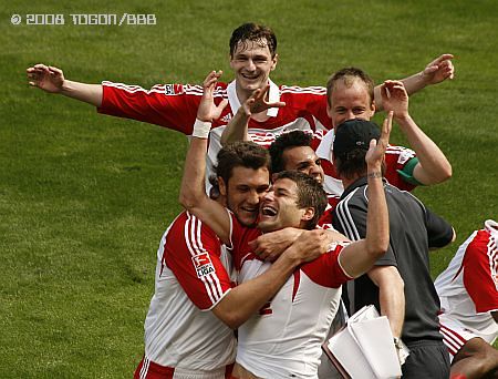 Der 1. FC Köln hat den Aufstieg in die erste Fußball-Bundesliga perfekt gemacht. Nach einer Klassevorstellung besiegte der FC den Aufstiegskonkurrenten aus Mainz hochverdient mit 2:0. Die Gäste blieben weitgehend harmlos und hatten dem couragierten Spiel der Kölner kaum etwas entgegen zu setzen. Matchwinner war der erst in der Rückrunde gewaltig in Fahrt gekommene Libanese Roda Antar, der beide Treffer markierte und damit die 50.000 Zuschauer im ausverkauften RheinEnergieStadion in einen Freudentaumel stürzte. Nach Abpfiff des guten Schiedsrichters Michael Kempter stürmten den Fans den Innenraum und verwandelten das Stadion in die größte Partyzone Kölns.