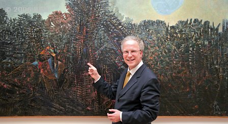 Unter den Neuzugängen ist auch das Gemälde "Ein wenig Ruhe" (Öl auf Leinwand, unser Bild) aus dem Jahre 1939, das nicht nur wegen seiner beeindruckenden Ausmaße eine Sonderrolle einnimmt, sondern auch wegen seiner Herkunft. Es befindet sich im Besitz der National Gallery of Art in Washington. Eine "Sensation" sei es, dass dieses bedeutende Werk jetzt in den kommenden sechs Monaten in Brühl ausgestellt werde, betonte Dr. Achim Sommer. Weiterhin befinden sich unter den neuen Werken visionäre Landschaften, imaginäre Wesen, mythologische Gärten und kosmologische Welten, die seit Jahrzehnten erstmals wieder öffentlich zu sehen sind. Sie lassen die Bildwelten des Künstlers in außergewöhnlichen Perspektiven prismatisch aufleuchten.