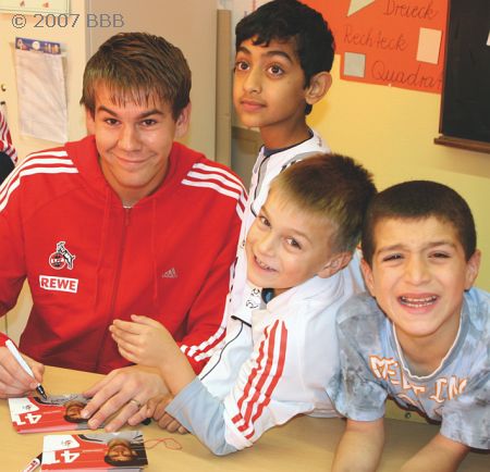 (tg) Einen Sachkundeunterricht der etwas anderen Art erlebten kürzlich die Schülerinnen und Schüler der Klasse 3 a der Katholischen Grundschule in Brühl-Vochem. Das Thema „Berufe“ stand auf dem Stundenplan. Und zu Gast im Klassenzimmer war plötzlich ein leibhaftiger Fußballprofi in Person von Thomas Kessler, dem zweiten Torwart des 1. FC Köln. Unter den Klängen der FC-Hymne empfingen die 18 aufgeregten Kinder den sympathischen 21-Jährigen und überschütteten ihn mit den unterschiedlichsten Fragen: Ob er Pizza essen darf, welche Haustiere er hat, wo er gerne Urlaub macht, ob er einen Freundin hat oder was seine Lieblingsfächer waren.
