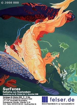 (tg) In der Kanzlei der Rechtsanwälte Felser, Uhlstraße 19-23, wird ab dem 26. Oktober die Ausstellung „SurFaces“ der jungen Düsseldorfer Künstlerin Katharina Aleksandra von Koschembahr gezeigt. Präsentiert werden bei der von Reiner Borowski organisierten Bilderschau Arbeiten der Malerin aus den Jahren 2004 bis 2008.