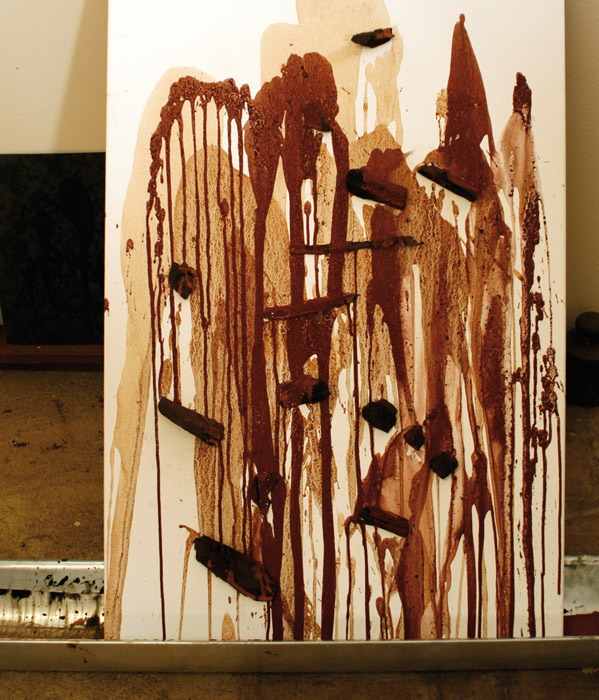 Aktuell beschäftigt er sich mit Gießbildern. Die Leinwand ist fast senkrecht an die Wand gelehnt. Darauf hat Willi Frommberger einige Hölzchen arrangiert, bevor er verschiedene Farben darübergießt. Die Farben hat er selbst hergestellt, oft aus Rohstoffen, die er in Brühl und Umgebung gefunden hat. Dazu gehören Braunkohle, Bistertinte und Eisenoxyd. „Die Farbe hat einen inneren Drang, zu Formen und Figuren zu werden“, sagt der Künstler, während er betrachtet, wie sein neues Werk Konturen annimmt. „Ich zwinge die Farbe zu nichts. Die Farbe hat eine eigene Dynamik, besonders, wenn sie gegossen wird.“ Willi Frommbergers Kunst wirkt organisch, figürlich. Er lässt auch äußerliche Einflüsse zu. Es kommt vor, dass im unbeheizten Atelier manches im Winter kristallisiert.
