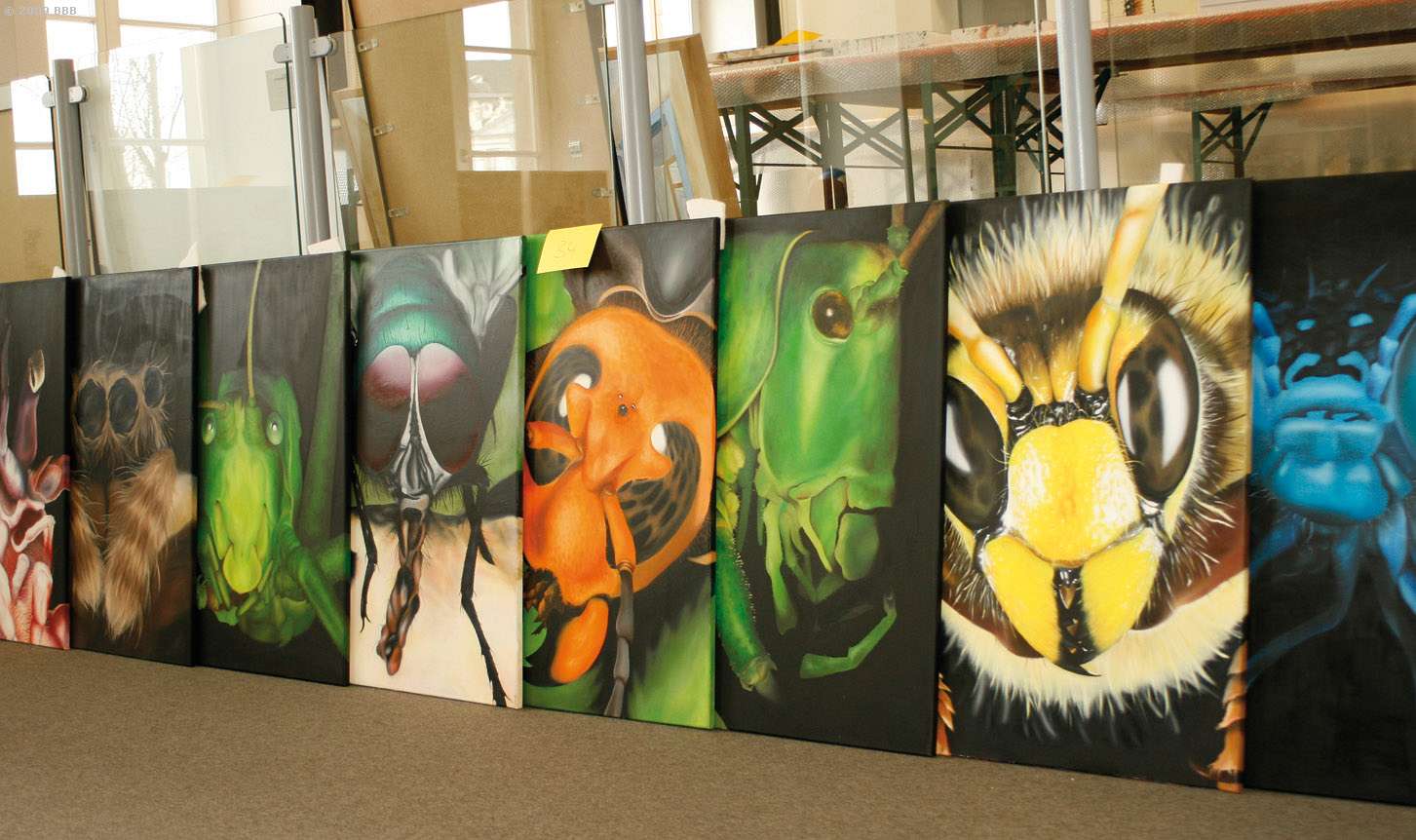 Denn bei den „Porträts“ handelt es sich um eine Serie knallbunter großformatiger Insektenköpfe. Wir sehen u.a. eine Wespe, eine Libelle, eine Fliege, einen Grashüpfer, eine Spinne, einen Käfer. In kräftigen Farben: orange, blau, grün oder gelb. „Ich interessiere mich für das Insekt an sich“, begründet Hanne Willnow ihre ungewöhnliche Motivwahl. „Insekten faszinieren mich. Ihre ungewöhnlichen Formen haben mich malerisch gereizt.“