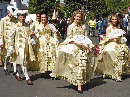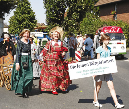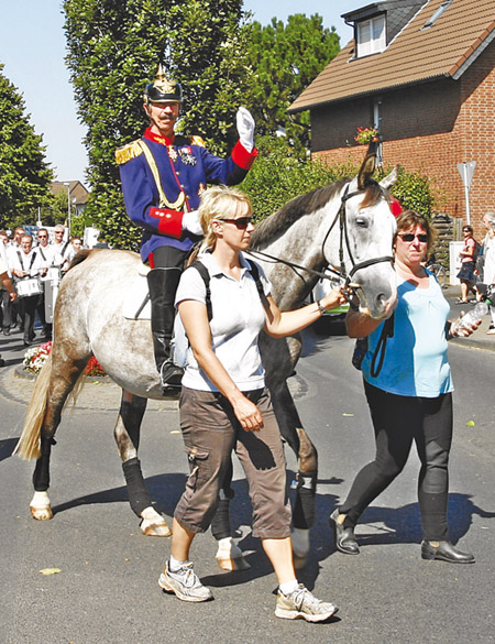 Direkt in Sichtweite des Kirchturms, auf dem Fußballplatz an der Oberstraße stand das Festzelt. Aber nicht nur hier ging richtig die Post ab. Das Programm, das die Verantwortlichen um Dorfgemeinschaftsvorsitzenden Winfried Müller zusammengestellt und in monatelanger Arbeit akribisch vorbereitet hatten, konnte sich sehen lassen: nicht nur die samstäglichen Radrennen konnten begeistern, auch und ganz besonders der historische Festumzug am Sonntag lockte bei Kaiserwetter unzählige Zuschauer von nah und fern in Brühls südlichsten Vorort. Da war es dann selbstverständlich, dass auch seine Exzellenz Kaiser Wilhelm II. persönlich und hoch zu Ross nach Schwadorf kam um die Huldigungen seiner Untertanen entgegenzunehmen.
