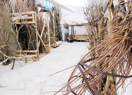 Der Brühler Kunstverein zeigt noch bis zum 12. September jeweils von Mittwoch bis Sonntag oder nach Vereinbarung in der Alten Schlosserei des Marienhospitals die Installation „Holzweg“ von Clemens Botho Goldbach. Darin beschreibt und dokumentiert der Düsseldorfer Künstler nicht nur den Transport bzw. den Weg des für seine Installation benötigten Holzes von seinem Lager in Münster nach Brühl und anschlie- ßend nach Hagen. Sondern er installiert und konstruiert seine umfangreiche Gehölzsammlung zu einem raumgreifenden Waldszenario. Er holt damit den natürlichen Raum mit seinen aufragenden Stämmen, dem dichtem Unterholz, Humusböden und Laubhügeln sowie Teiche und Tümpel in den Innenraum.
