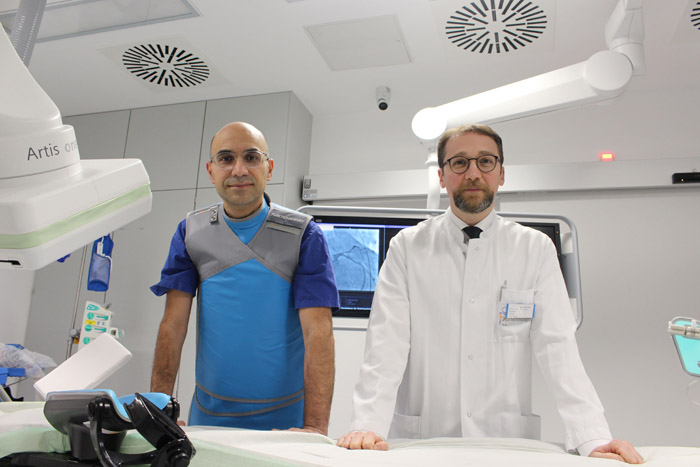 Denn gerade Herz- und Gefäßerkrankungen gehören zu den vorherrschenden Krankheiten in Deutschland und zählen zu den häufigsten Todesursachen. Eine schnelle Erstversorgung kann Leben retten. Chefarzt Privatdozent Dr. med. Rami Homsi (Bild rechts neben Reza Abbassian) ist Herzspezialist und begeistert vom neuen Linksherzkatheter-Messplatz „Unsere Patienten können sofort untersucht und behandelt werden. Im Ernstfall ist schnelle und präzise Hilfe erforderlich“, weiß der Mediziner.