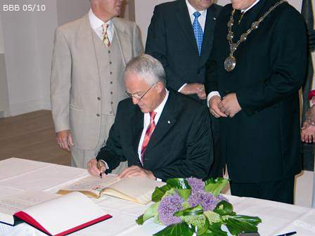 v.l.: Brühls Bürgermeister Michael Kreuzberg, Ministerpräsident von NRW, Jürgen Rüttgers, Bundespräsident Horst Köhler mit Gattin Eva Luise Köhler und Hans-Peter Krämer, Kreissparkasse Köln schreiten zur Eröffnung des Max Ernst Museums.