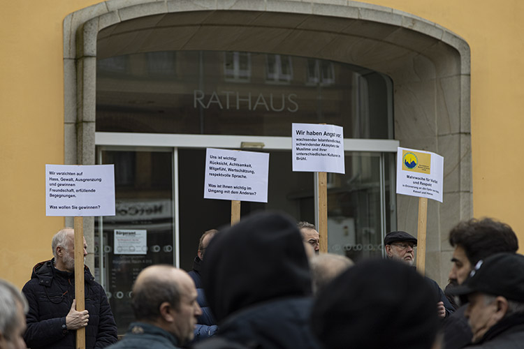 Die Initiative "Christen begegnen Muslimen - Muslime begegnen Christen" in Brühl hatte eingeladen, und viele waren dieser Einladung gefolgt, und versammelten sich am Samstag, dem 29.02.2020 um "Fünf vor Zwölf" vor dem Brühler Rathaus in der Uhlstraße.