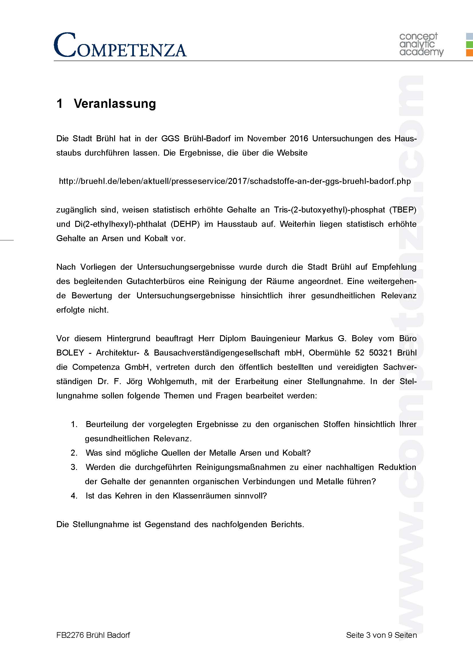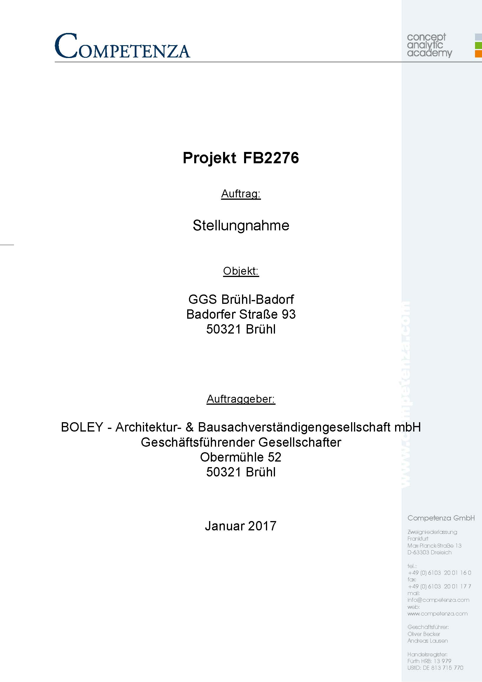 Vor diesem Hintergrund beauftragt Herr Diplom Bauingenieur Markus G. Boley  die Competenza GmbH, vertreten durch den öffentlich bestellten und vereidigten Sachver- ständigen Dr. F. Jörg Wohlgemuth, mit der Erarbeitung einer Stellungnahme.