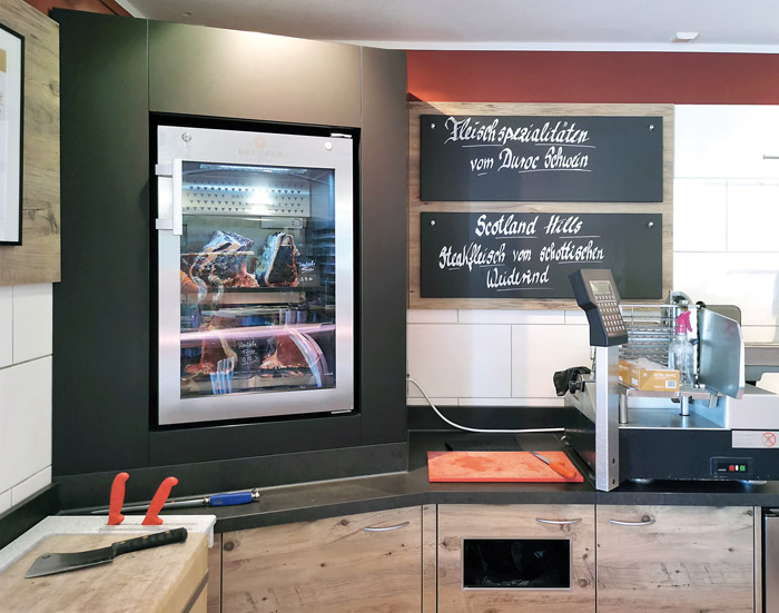 Im Zuge des Umbaus wurde im Thekenbereich ein hochwertiger Reifeschrank für Dry-Aged-Fleisch installiert. Dieser Reifeschrank schafft durch modernste Klima- und Ablufttechnik die Voraussetzung, dass Fleisch mindestens drei Wochen trocken reift und somit sein intensives und nussiges Aroma für den perfekten Steakgenuss erhält. Zu den weiteren Fleischspezialitäten zählen Fleisch vom reinrassigen DUROC-Schwein mit hohem Anteil an intramuskulären Fett und bestes schottisches Rindfleisch, SCOTLAND HILLS, aus traditioneller, artgerechter Mutterkuhhaltung mit Grasfütterung.