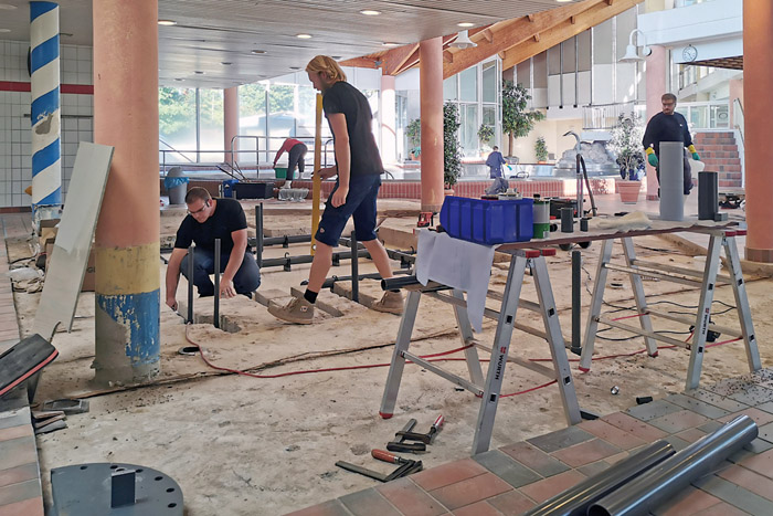 In der diesjährigen Lockdown-Phase wurde festgestellt, dass das Spaßbadbecken aus Edelstahl mit verbundenem Strömungskanal erheblich Wasser verliert. Gleichzeitig fand aber bereits der sehr aufwändige Komplettumbau des Kinderbeckens statt. So kam nun zu einer geplanten Baustelle noch ein Beckenschaden, der im Außenbereich auch Erdarbeiten mit Bagger mit sich brachte. Was die Arbeiten nun zusätzlich erschwerte, ist die zusammenhängende Technik im Spaßbad für Frischwasserzufuhr und moderne Filtertechnik. Diese befindet sich im Keller unter dem Spaßbadbereich. Somit musste zunächst der Beckenschaden mit Dichtigkeitsprüfung behoben werden, bevor nun die neuen Technikanschlüsse des Kinderbeckens gelegt werden können. Leider befinden sich diese beiden Großbaustellen genau auf dem fußläufigen Weg des Saunagasts zur Sauna. Aus sicherheitstechnischen Gründen war es deshalb unmöglich, den Saunapark bisher zu öffnen.
